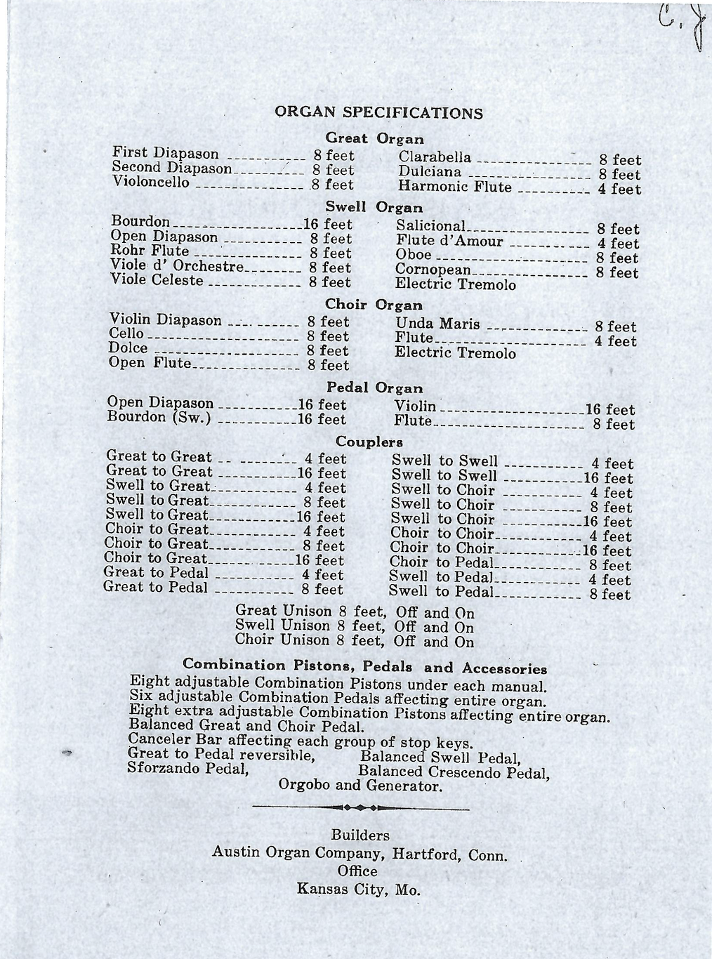 In 1926, the church had rebuilt on the current location. The sanctuary featured a new Austin Pipe Organ. (Opus Number 1,360) That organ had fewer pipes, but was electrically powered. (The 1926 specification at right)